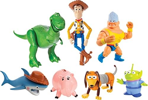 Sheriff Woody, Slinky Dog, dinosaur Rex, piggybank Hamm, an Alien, former wrestler Rocky Gibraltar and an exclusive Shark come together in this pack ready for play out of the box.